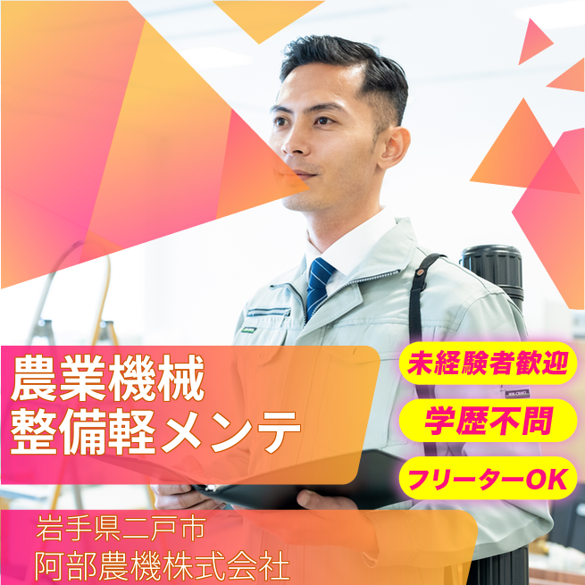 企業 阿部農機株式会社 給与詳細 月収例 172,000円 時給例 1,075円 勤務地 岩手県二戸市 仕事内容 「農機整備で“プロフェッショナル”を目指す!」