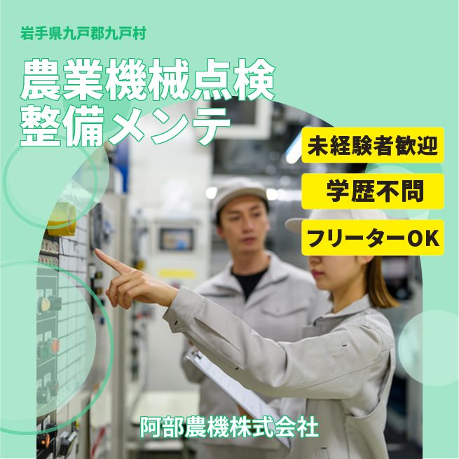 過去の先輩方は飲食店、事務職など、整備未経験の方でも入社いただけます。 企業名 阿部農機株式会社正社員求人