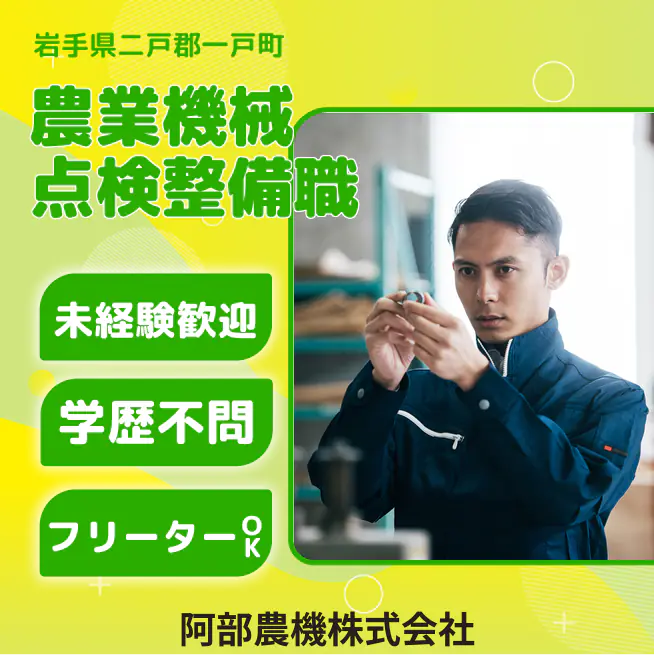 企業 阿部農機株式会社 給与詳細 月収例 172,000円 時給例 1,075円 勤務地 岩手県二戸郡一戸町 仕事内容 農業機械の点検整備や、トラクター・田植機・チェンソーなどの小物商品のメンテナンスなどを担当いただきます。