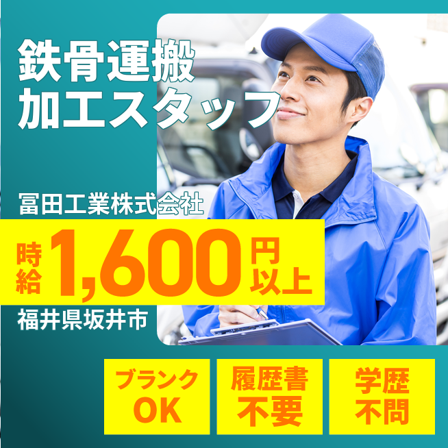 企業 冨田工業株式会社 給与詳細 月収例 262,000円 時給例 1,638円 勤務地 福井県坂井市 仕事内容 鋼構造物の設計・製作および施工を行う当社にて、鉄骨運搬・加工業務を担当いただきます。