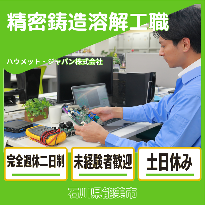 企業 ハウメット・ジャパン株式会社 給与詳細 月収例 207,500円 時給例 1,297円 勤務地 石川県能美市 仕事内容 溶解工として、発電用ガスタービンや航空機ジェットエンジンに使われる部品の製造に携わっていただきます。