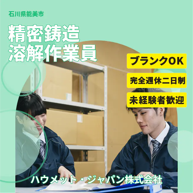 企業 ハウメット・ジャパン株式会社 給与詳細 月収例 207,500円 時給例 1,297円 勤務地 石川県能美市 仕事内容 溶解工として、発電用ガスタービンや航空機ジェットエンジンに使われる部品の製造に携わっていただきます。
