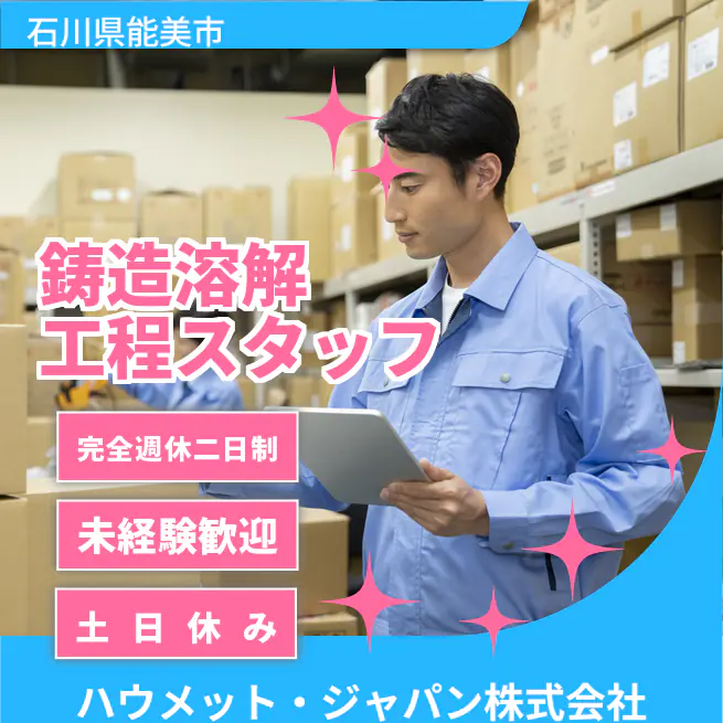 企業 ハウメット・ジャパン株式会社 給与詳細 月収例 207,500円 時給例 1,297円 勤務地 石川県能美市 仕事内容 「溶解工として世界の空と陸を支える!」