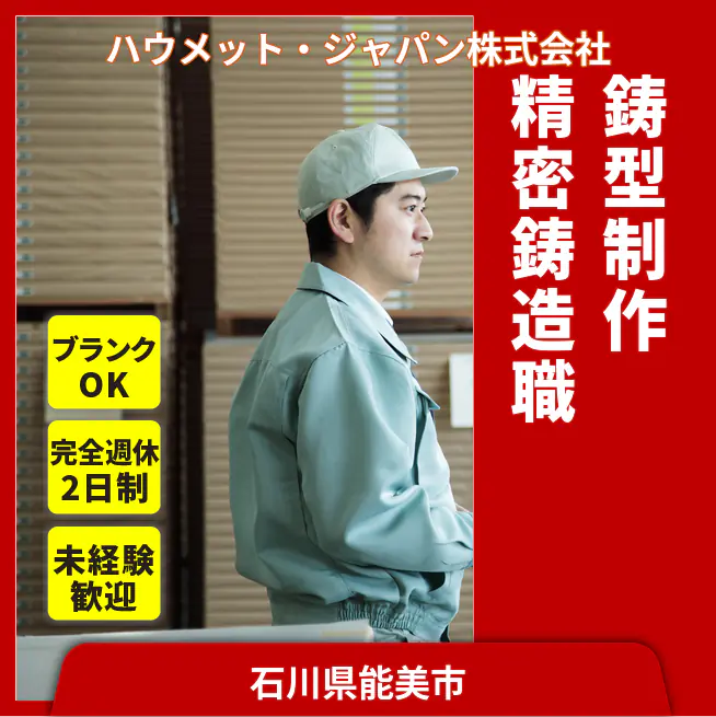 企業 ハウメット・ジャパン株式会社 給与詳細 月収例 207,500円 時給例 1,297円 勤務地 石川県能美市 仕事内容 鋳型作りの工程に携わってみたい。