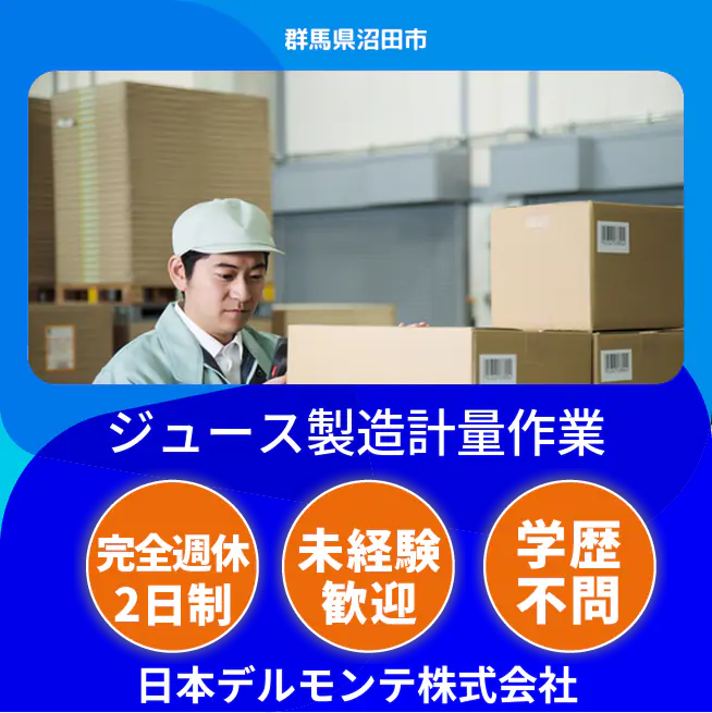 デルモンテの飲料製品づくりに携わる工場で、原料の計量やドラム缶等の開缶などの製造業務を担当します。学歴や経験は一切問いません。先輩社員がしっかりサポートしてくれるので、製造未経験でも安心してスタートできます。交替勤務ですが、基本週休2日制でワークライフバランスを重視できます。