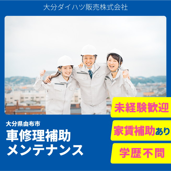 企業 大分ダイハツ販売株式会社 給与詳細 月収例 174,000円 時給例 1,088円 勤務地 大分県由布市 仕事内容 【業務概要】