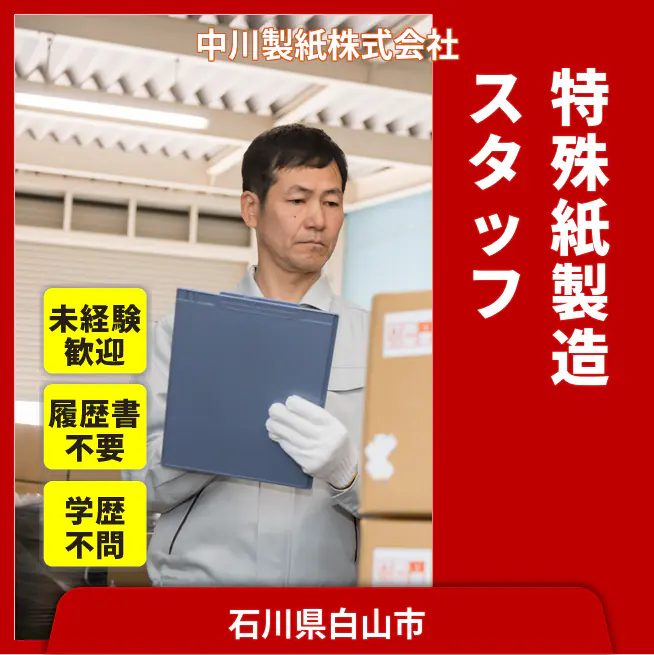 企業 中川製紙株式会社 給与詳細 月収例 190,000円 時給例 1,188円 勤務地 石川県白山市 仕事内容 紙の巻取りや染色など産業用特殊紙の製造をお任せします。