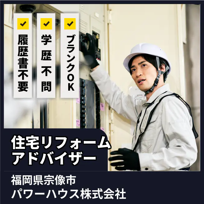 企業 パワーハウス株式会社 給与詳細 月収例 250,000円 時給例 1,563円 勤務地 福岡県宗像市 仕事内容 外壁・内装リフォームの提案業務を行っていただきます。