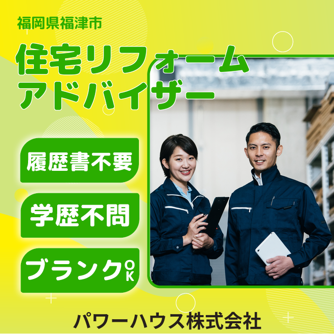 企業 パワーハウス株式会社 給与詳細 月収例 250,000円 時給例 1,563円 勤務地 福岡県福津市 仕事内容 お客様のニーズに合わせて、住宅全般のリフォームアドバイザーとしてご活躍いただきます。