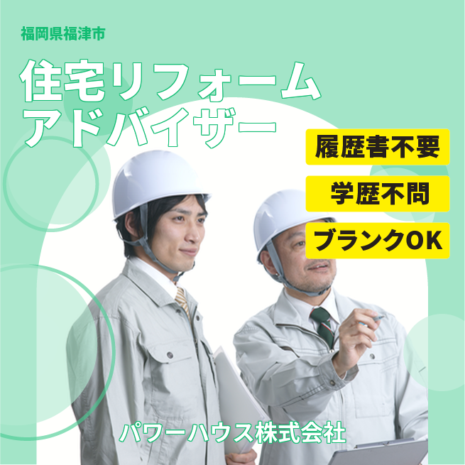 企業 パワーハウス株式会社 給与詳細 月収例 250,000円 時給例 1,563円 勤務地 福岡県福津市 仕事内容 「リフォーム営業で培った提案力を、もっと活かしたい?」
