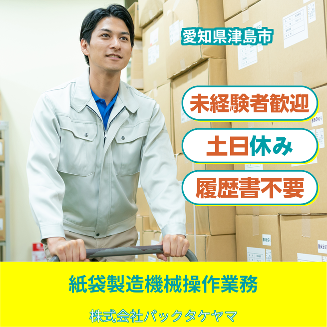 企業 株式会社パックタケヤマ 給与詳細 月収例 178,000円 時給例 1,113円 勤務地 愛知県津島市 仕事内容 紙袋を製造する部署にて、製袋機のオペレーター業務を担当いただきます。