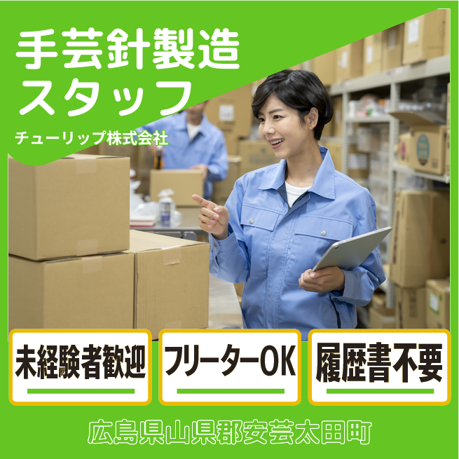 企業 チューリップ株式会社 給与詳細 月収例 180,000円 時給例 1,125円 勤務地 広島県山県郡安芸太田町 仕事内容 ~未経験歓迎~世界中の手芸愛好家の方に愛用されている手芸用の針や電子製品に使用される針の製造や検品などをお願いします。
