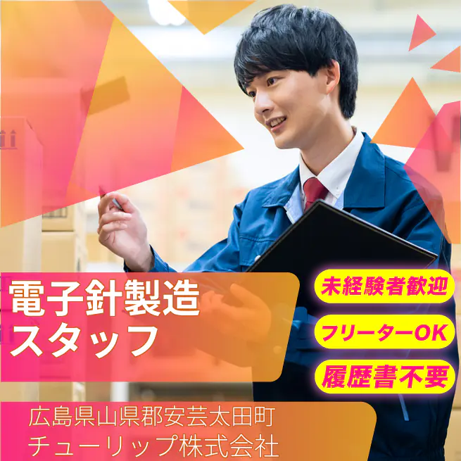 企業 チューリップ株式会社 給与詳細 月収例 180,000円 時給例 1,125円 勤務地 広島県山県郡安芸太田町 仕事内容 手芸・電子製品用の針製造や検品作業を行います。