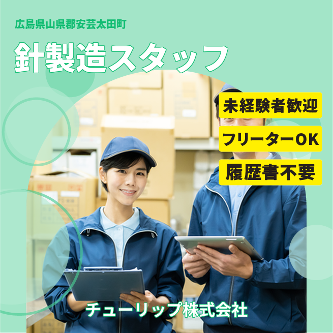企業 チューリップ株式会社 給与詳細 月収例 180,000円 時給例 1,125円 勤務地 広島県山県郡安芸太田町 仕事内容 縫針・編み針など手芸用針の製造業務をお任せします。