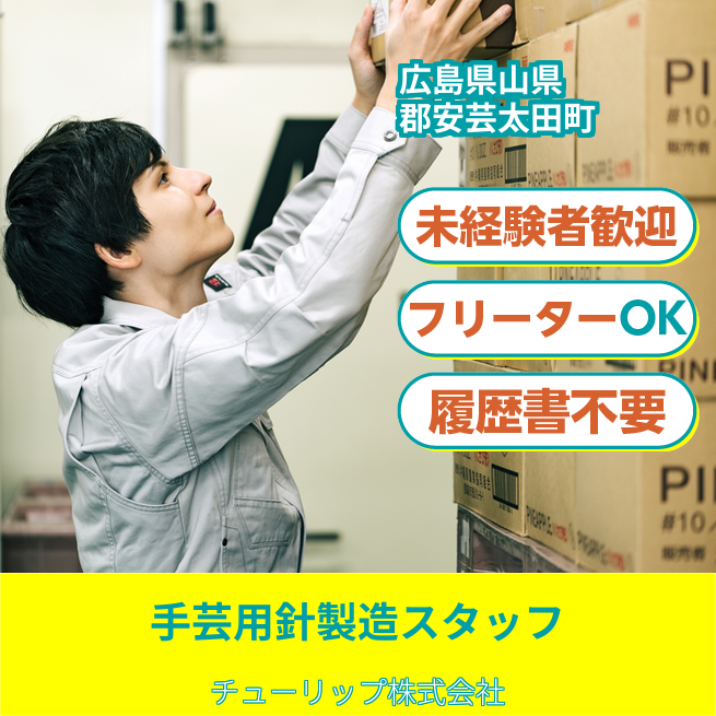 企業 チューリップ株式会社 給与詳細 月収例 180,000円 時給例 1,125円 勤務地 広島県山県郡安芸太田町 仕事内容 手芸用の針や電子部品向けの針を製造・検品し、モノづくりの楽しさを味わいたい方に最適!