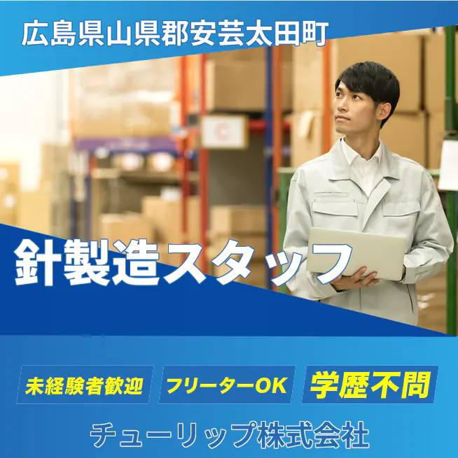 企業 チューリップ株式会社 給与詳細 月収例 180,000円 時給例 1,125円 勤務地 広島県山県郡安芸太田町 仕事内容 手芸用の針や電子製品に使用される針の製造や検品などをお願いします。