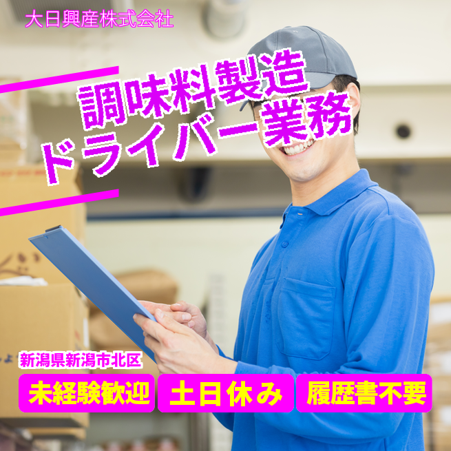企業 大日興産株式会社 給与詳細 月収例 163,200円 時給例 1,020円 勤務地 新潟県新潟市北区 仕事内容 ~おすすめPoint~
