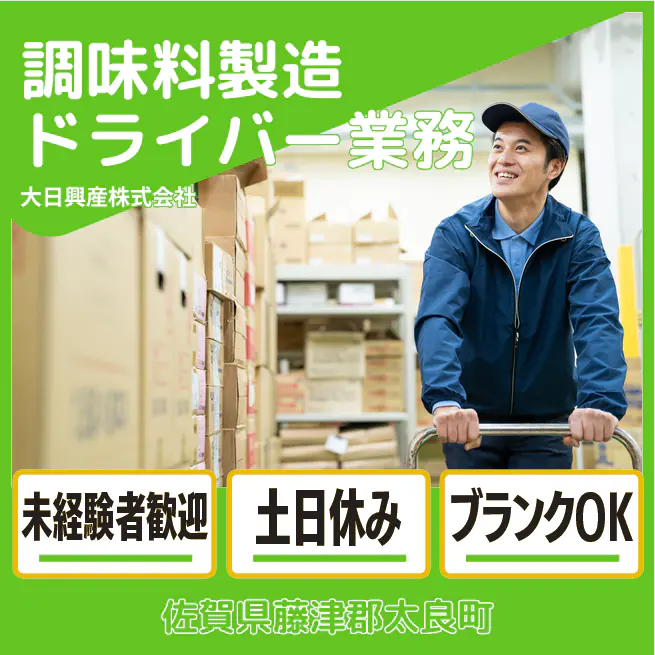 企業 大日興産株式会社 給与詳細 月収例 163,200円 時給例 1,020円 勤務地 佐賀県藤津郡太良町 仕事内容 「未経験から始めるスープの素の製造&運送!」