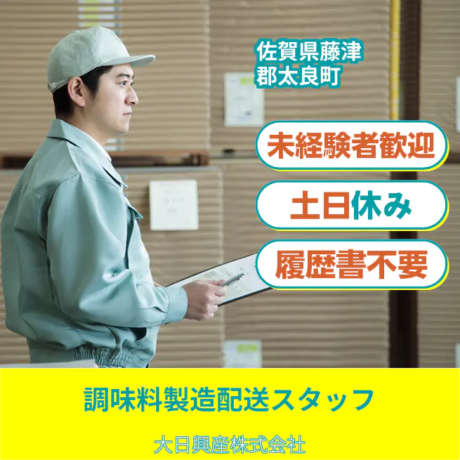 企業 大日興産株式会社 給与詳細 月収例 163,200円 時給例 1,020円 勤務地 佐賀県藤津郡太良町 仕事内容 「食を扱う仕事に携わりたいけど、飲食店勤務は厳しいかな…」