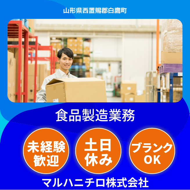 ※残業は30分~1時間程度発生する日もあり 求人番号 71321-8a 給与詳細 月収例 213,000円 時給例 1,331円 応募の流れ 本ページ内<応募する>ボタンより、必要項目をご入力の上、ご応募ください。 勤務地 【勤務地】山形県西置賜郡白鷹町大字鮎貝2888-2 勤務時間 【勤務地】8:30~17:20(休憩 1時間)