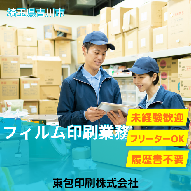企業 東包印刷株式会社 給与詳細 月収例 250,000円 時給例 1,563円 勤務地 埼玉県吉川市 仕事内容 パッケージフィルムの印刷や機械の清掃などをお任せします!