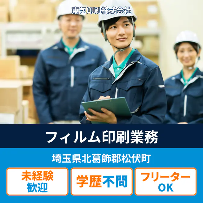企業 東包印刷株式会社 給与詳細 月収例 250,000円 時給例 1,563円 勤務地 埼玉県北葛飾郡松伏町 仕事内容 パッケージフィルムの印刷や機械の清掃などをお任せします!