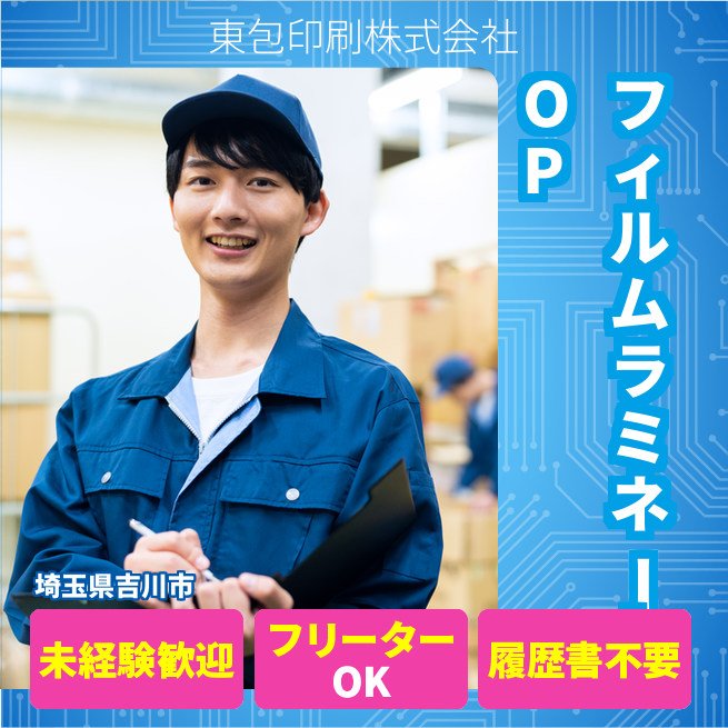 企業 東包印刷株式会社 給与詳細 月収例 250,000円 時給例 1,563円 勤務地 埼玉県吉川市 仕事内容 印刷済みのフィルムと貼り合わせフィルムを大型機械にてラミネートする機械オペレーターのお仕事です。