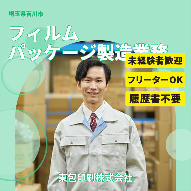 企業 東包印刷株式会社 給与詳細 月収例 250,000円 時給例 1,563円 勤務地 埼玉県吉川市 仕事内容 大型機械でのフィルムパッケージ製造業務を担当していただきます。