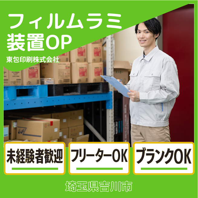 企業 東包印刷株式会社 給与詳細 月収例 250,000円 時給例 1,563円 勤務地 埼玉県吉川市 仕事内容 「ラミネート機械オペレーターで未経験スタート!」