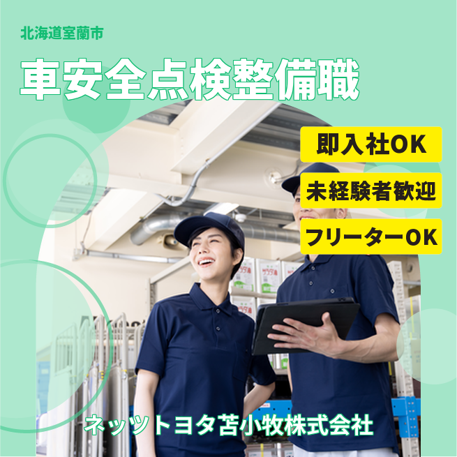 会社負担のトヨタ独自の資格・教育制度があり、入社後資格取得が可能です。また、フロントや営業等へのキャリアチェンジも可能です。 求人番号 74229-3d 給与詳細 月収例 165,000円 時給例 1,031円 応募の流れ 本ページ内<応募する>ボタンより、必要項目をご入力の上、ご応募ください。 勤務地 【勤務地】北海道室蘭市東町1丁目1番7号 勤務時間 【勤務地】09:15~18:00(実働7時間45分、休憩 60分)