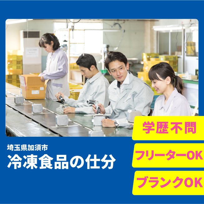※実際と異なるケースもございます。 交通費 支給あり 応募の流れ 本ページ内<応募する>ボタンより、必要項目をご入力の上、ご応募ください。 勤務地 【勤務地】埼玉県加須市中ノ目 勤務時間 【勤務地】①09:00~18:00 休憩60分