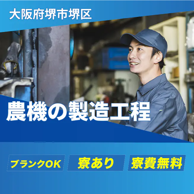 給与詳細 月収例 280,000円 日給例 11,500円 勤務地 大阪府堺市堺区 仕事内容 【トラクタ・エンジンの製造(組立・加工・塗装・部品補給・搬送)】