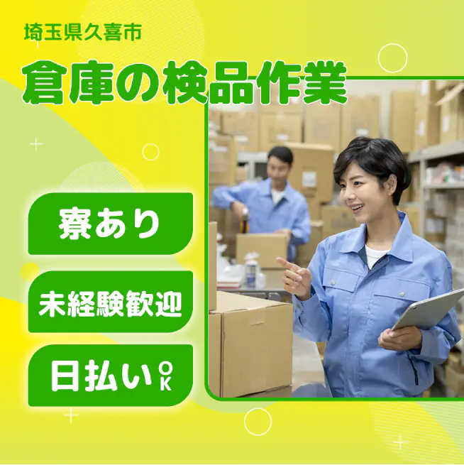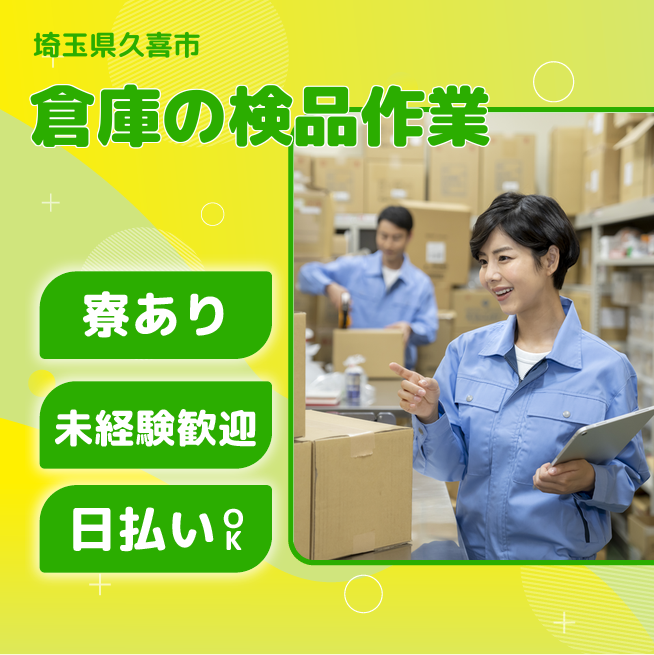 ※実際と異なるケースもございます。 交通費 支給あり 応募の流れ 本ページ内<応募する>ボタンより、必要項目をご入力の上、ご応募ください。 勤務地 【勤務地】埼玉県久喜市菖蒲町菖蒲 勤務時間 【勤務地】①08:00~17:00 休憩60分