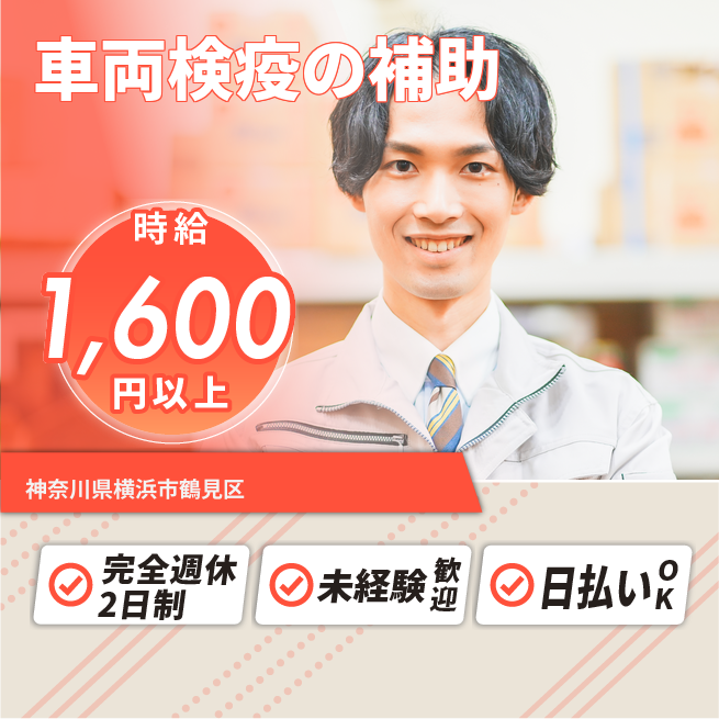 ※実際と異なるケースもございます。 交通費 支給あり 応募の流れ 本ページ内<応募する>ボタンより、必要項目をご入力の上、ご応募ください。 勤務地 【勤務地】神奈川県横浜市鶴見区大黒ふ頭 勤務時間 【勤務地】①08:00~17:00 休憩 60分