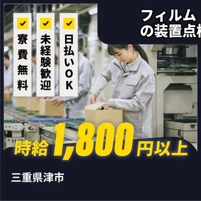給与詳細 月収例 290,000円 時給例 1,800円 勤務地 滋賀県大津市 仕事内容 【フィルム製造オペレーション・装置の点検メンテナンス】