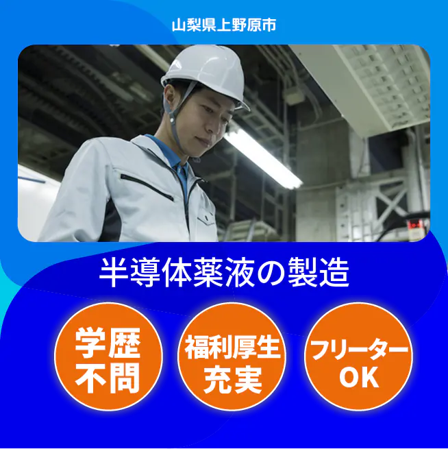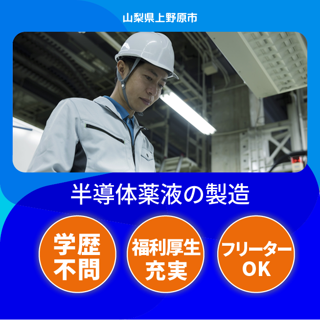 給与詳細 月収例 260,000円 日給例 11,750円 勤務地 山梨県上野原市 仕事内容 【半導体薬品の製造】