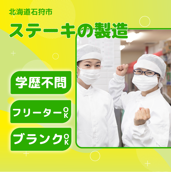 給与詳細 月収例 204,000円 時給例 1,200円 勤務地 北海道石狩市 仕事内容 【ステーキなどの加工製造スタッフ募集】