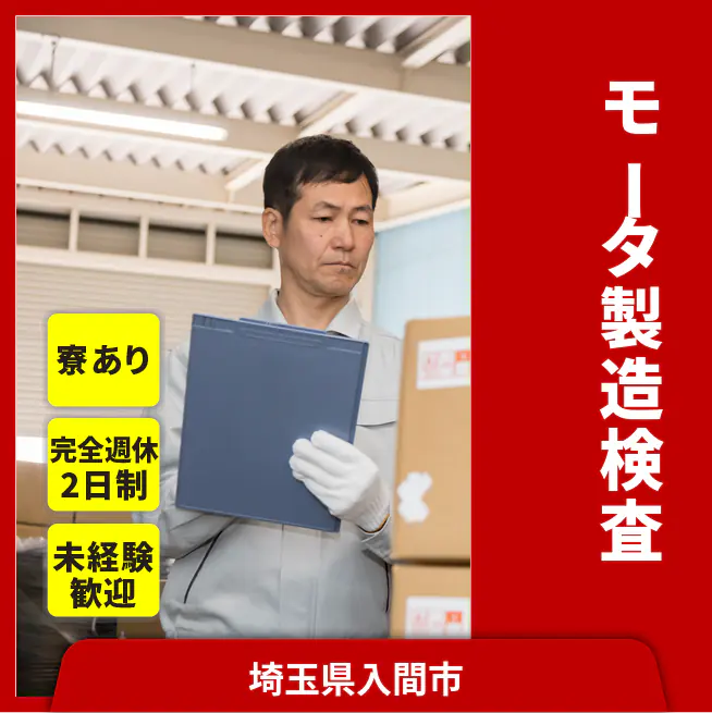 ※実際と異なるケースもございます。 交通費 支給あり 応募の流れ 本ページ内<応募する>ボタンより、必要項目をご入力の上、ご応募ください。 勤務地 【勤務地】埼玉県入間市上藤沢 勤務時間 【勤務地】08:30~17:00 休憩45分