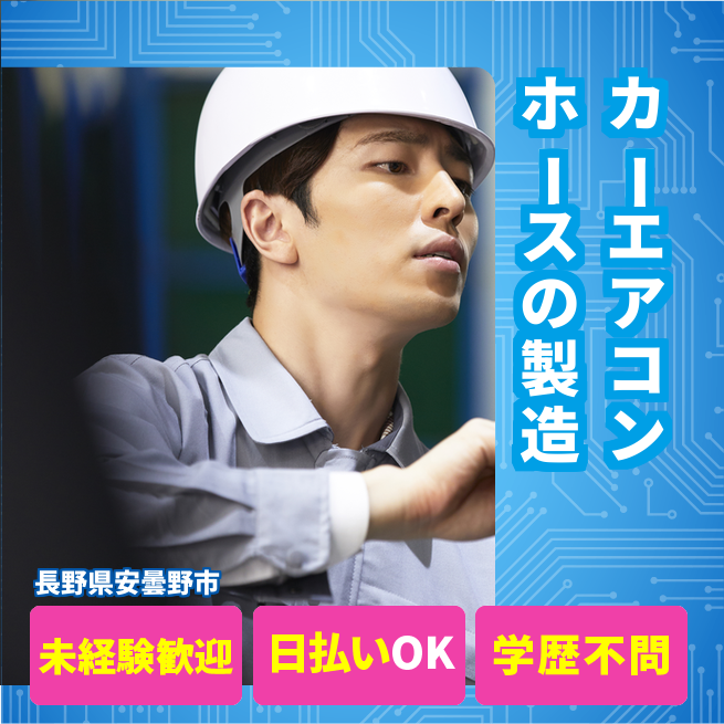 給与詳細 月収例 250,000円 時給例 1,200円 勤務地 長野県安曇野市 仕事内容 【カーエアコン高低圧ホースの製造】