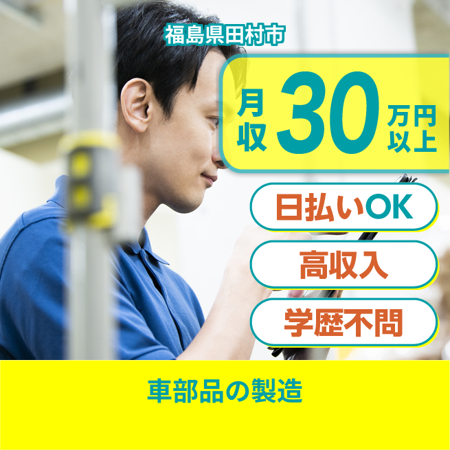 ※実際と異なるケースもございます。 交通費 支給あり 応募の流れ 本ページ内<応募する>ボタンより、必要項目をご入力の上、ご応募ください。 勤務地 【勤務地】福島県田村市船引町光陽台 勤務時間 【勤務地】①08:40~17:25 休憩45分