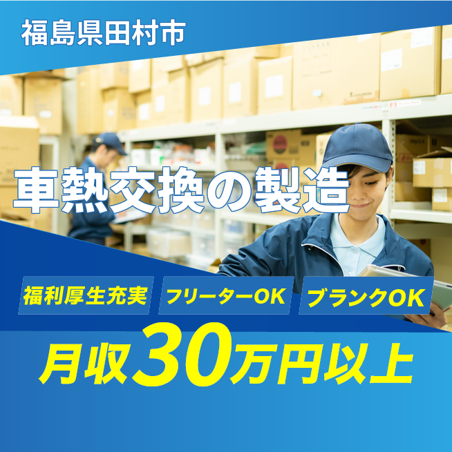 給与詳細 月収例 300,000円 日給例 12,000円 勤務地 福島県田村市 仕事内容 【ラジエーター・カーエアコン製造】