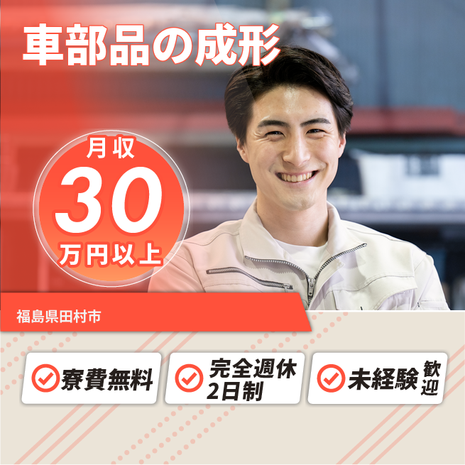 ・特になし 福利厚生 交通費:上限3万円迄/月 公開日 2025年02月01日 寮 部屋タイプ 個室寮 家具・備品 初めての一人暮らしでも安心♪生活に必要な備品はあらかじめそろっています。※寮による 家賃 無料 その他 寮周辺にはスーパーやコンビニもあり生活も便利!※寮による ★日払い制度あり!