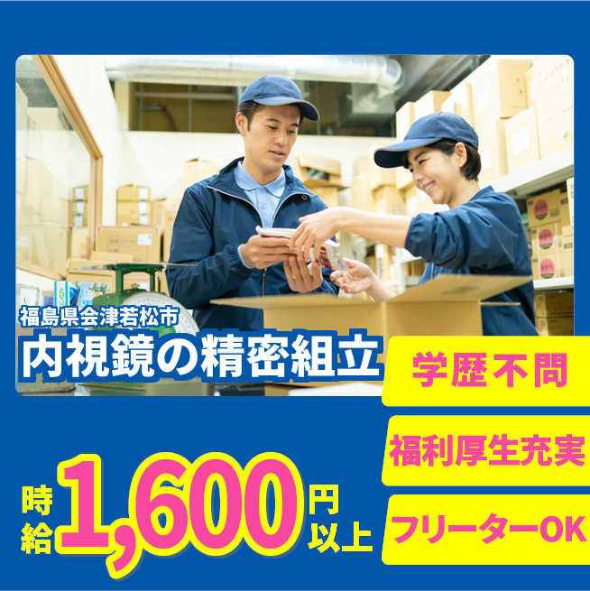 給与詳細 月収例 320,000円 時給例 1,600円 勤務地 福島県会津若松市 仕事内容 【内視鏡スコープ先端部の組立】