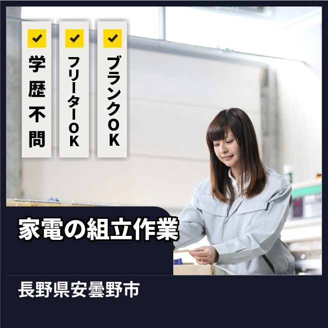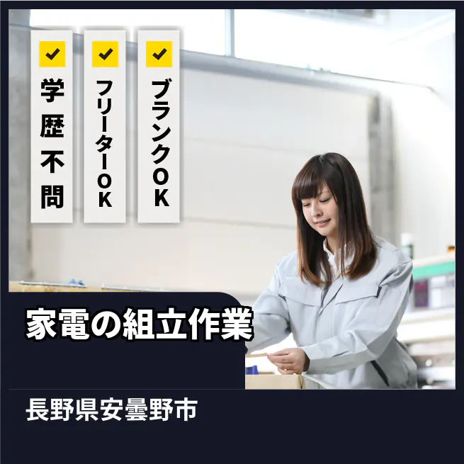 給与詳細 月収例 240,000円 時給例 1,200円 勤務地 長野県安曇野市 仕事内容 【電気製品の組み立て業務】
