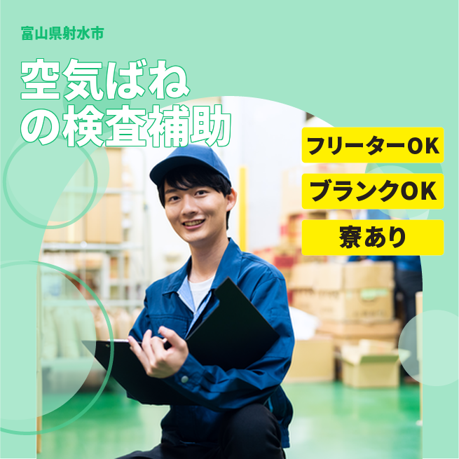 ※実際と異なるケースもございます。 交通費 支給あり 応募の流れ 本ページ内<応募する>ボタンより、必要項目をご入力の上、ご応募ください。 勤務地 【勤務地】富山県射水市戸破 勤務時間 【勤務地】①08:20~17:20 休憩60分