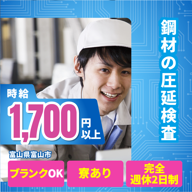 ※実際と異なるケースもございます。 交通費 支給あり 応募の流れ 本ページ内<応募する>ボタンより、必要項目をご入力の上、ご応募ください。 勤務地 【勤務地】富山県富山市中田 勤務時間 【勤務地】① 08:00~16:35 休憩 60分
