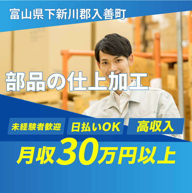 ※実際と異なるケースもございます。 交通費 支給あり 応募の流れ 本ページ内<応募する>ボタンより、必要項目をご入力の上、ご応募ください。 勤務地 【勤務地】富山県下新川郡入善町入膳 勤務時間 【勤務地】①08:00〜16:50 休憩60分
