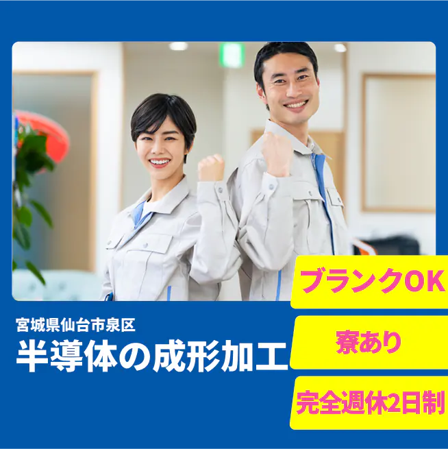 給与詳細 月収例 250,000円 日給例 10,400円 勤務地 宮城県仙台市泉区 仕事内容 【半導体製造装置用製品の成型・加工】