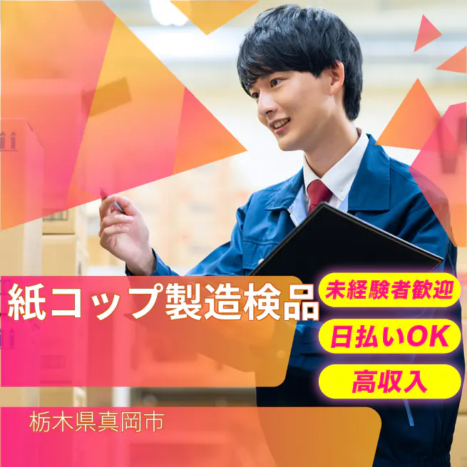 紙コップ工場での検品・箱詰め、マシンオペ・資材供給、裁断機オペなど。体力を使う資材運搬あり。