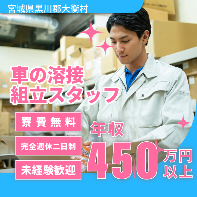 ※実際と異なるケースもございます。 交通費 支給あり 応募の流れ 本ページ内<応募する>ボタンより、必要項目をご入力の上、ご応募ください。 勤務地 【勤務地】宮城県黒川郡大衡村中央平 勤務時間 【勤務地】①08:00~16:40 休憩45分その他有給休憩15分